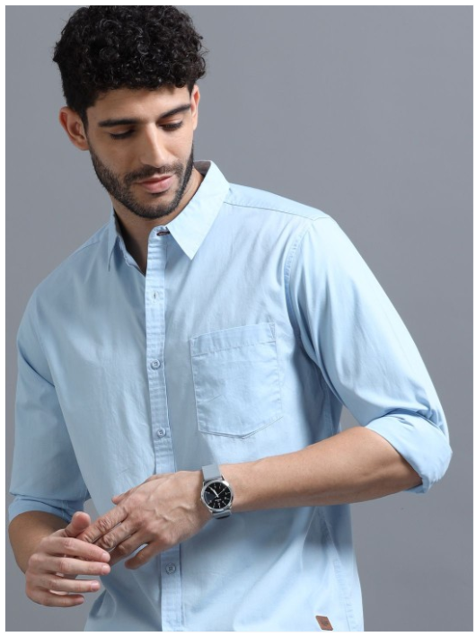 Blue solid regular-fit shirt, has a spread collar, button placket, Full sleeves and curved hem