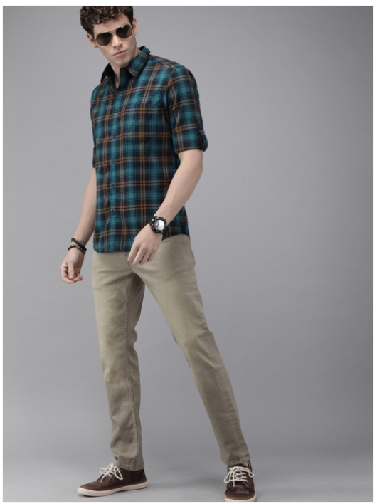 Navy Blue and Green checked casual shirt, has a spread collar, long sleeves, button placket, curved hem, and 1 patch pocket