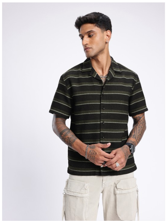Elevate your street style with the Street Savvy Striped Waffle Textured Shirt. Combining the timeless appeal of bold stripes with the unique waffle texture, this shirt is perfect for those who want to stand out effortlessly. Add it to your wardrobe, and let your style do the talking. Color: Black Neckline: Cuban Collar Sleeve Styling: Short Closure: Button