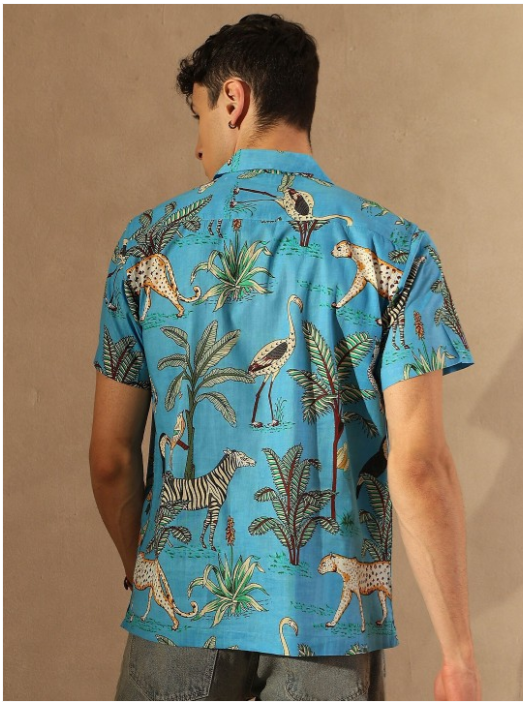 Blue tropical printed oversized Casual shirt ,has a cuban collar, button placket, na pocket, short regular sleeves, curved hem