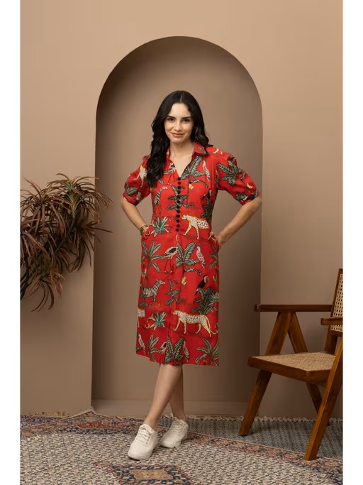 The Jungle Red Printed Cotton Midi Dress brings a bold, vibrant touch to your wardrobe with its eye-catching jungle print and comfortable, breathable 100% cotton fabric. Perfect for casual outings, summer days, or weekend getaways, this midi dress offers a relaxed yet stylish fit. The flattering midi length and unique print make it ideal for those who love a mix of boho chic and tropical fashion.