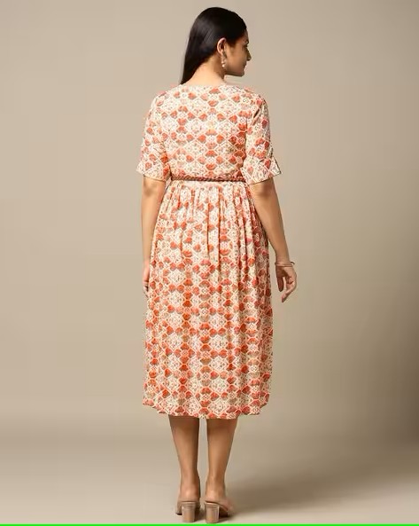 Women Geometric Print Round-Neck A-Line Dress with Belt