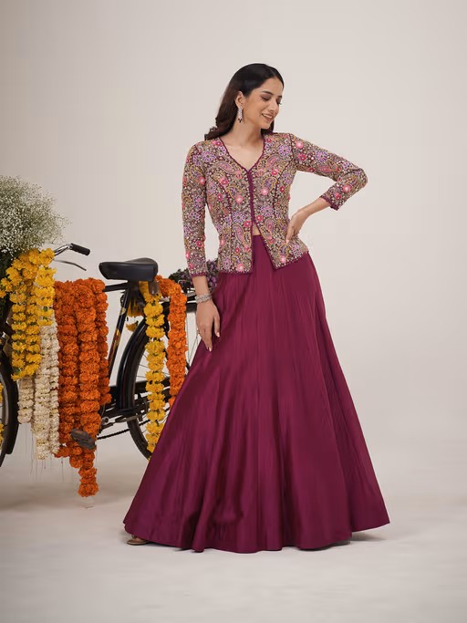 Magenta Hand Embroidered Top with Skirt (Set of 2)