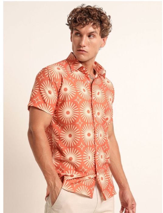 Orange floral printed opaque Casual shirt ,has a spread collar, button placket, na pocket, short regular sleeves, curved hem