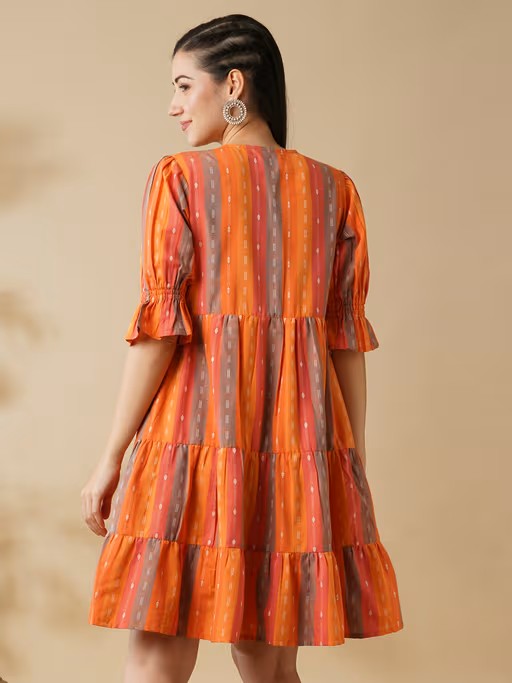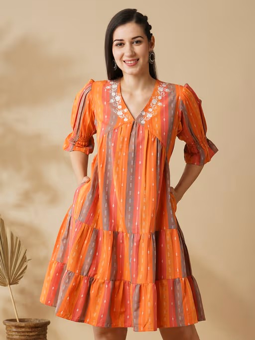 Women Multi Orange Floral Embroidered V-Neck Puff Sleeves Knee Length Tiered Fusion A-Line Dress