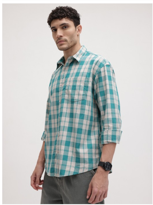 Blue and offwhite tartan checks checked opaque Casual shirt, has a spread collar, button placket, 1 patch pocket, long regular sleeves, curved hem