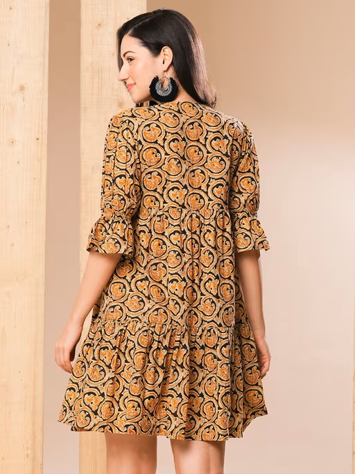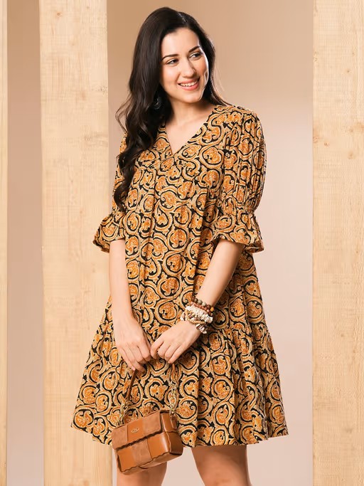 The Globus Women's Mustard All-over Printed A-Line Dress is a captivating blend of comfort and style. Made from cotton cambric, it features elbow-length Bell sleeves and a flattering V-neck. Adorned with ethnic motifs, this above-knee dress has a straight hemline and pleated detailing, perfect for adding an ethnic touch to your wardrobe.