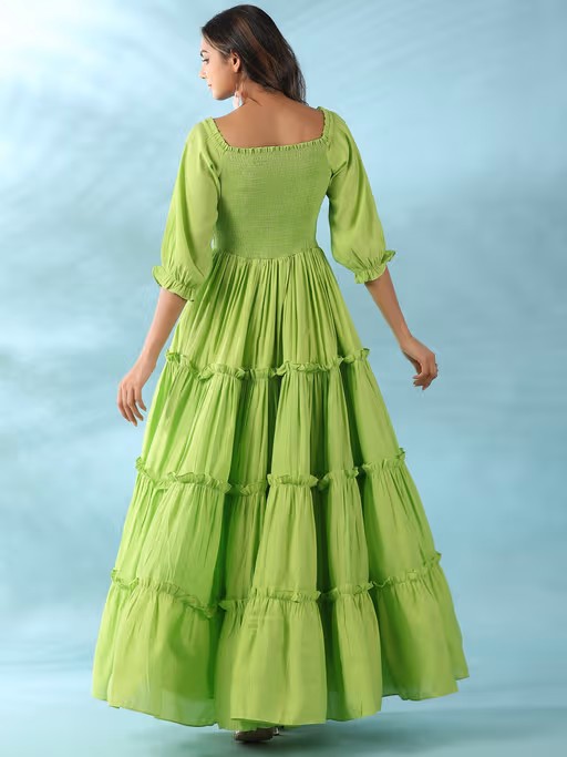This elegant solid green dress from Gillori will look beautiful on you. It is crafted from high-quality fabric. It features puff sleeves, square neck. Lots of flare adds to the grace.