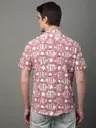 Peach Printed casual shirt, has a cuban collar, button placket, no pocket, half sleeves, curved hem, loose fit shirt, smooth and breathable fabric