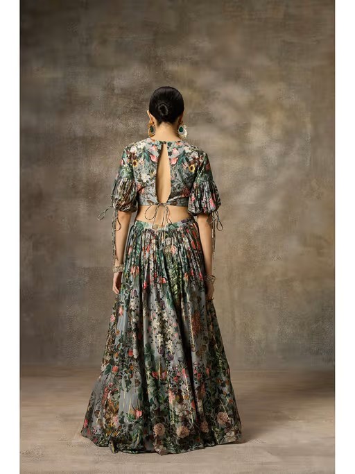 Green Botanical Print Blouse with Lehenga (Set of 2)