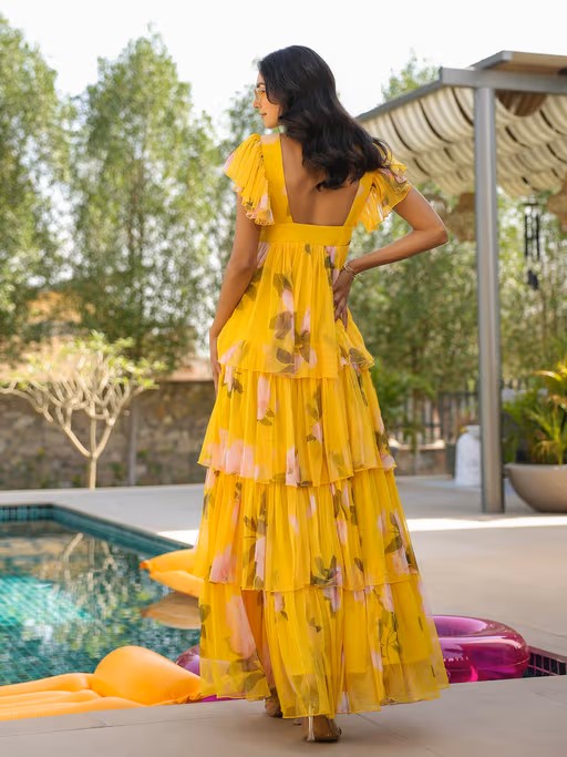 Bring The Sunshine In This Yellow Tulle Gown With Soft Floral Prints And Cascading Ruffle Tiers. Perfect For Destination Events And Statement Summer Moments.