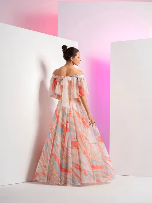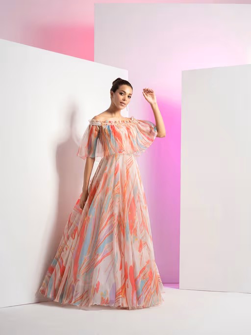 Refresh your closet with this MANDIRA WIRK Floaty Marble Embroidered Off Shoulder Pink Half Sleeve Gown. Made with the finest material, it is designed to perfection. Style it with matching footwear to complete the look.