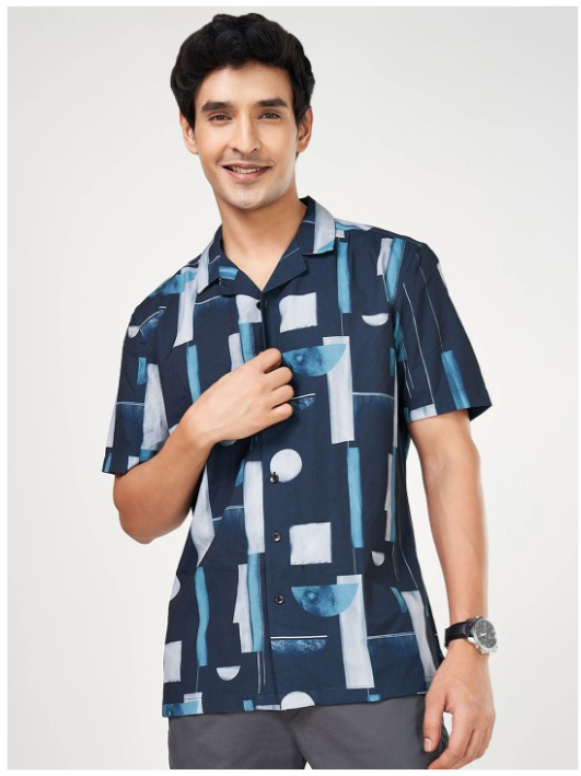Blue geometric solid opaque Casual shirt ,has a spread collar, button placket, na pocket, short regular sleeves, curved hem