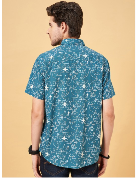 Blue & beige conversational printed opaque casual shirt ,has a spread collar, button placket, short regular sleeves, curved hem