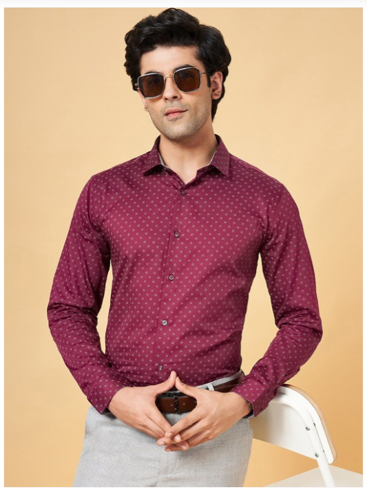 Red micro ditsy printed opaque casual shirt ,has a spread collar, button placket, long regular sleeves, curved hem