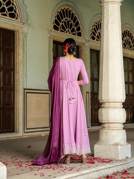 This Purple Suit Set Features A Flared Solid Anarkali Crafted with Heavy Gota Work, A Solid Pant with Elasticated Waistband and A Solid Chinon Dupatta with Gota Lace Work On Border.