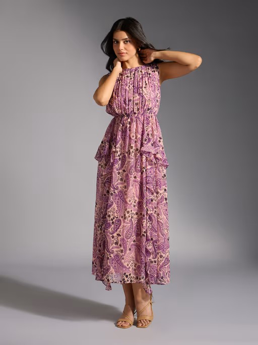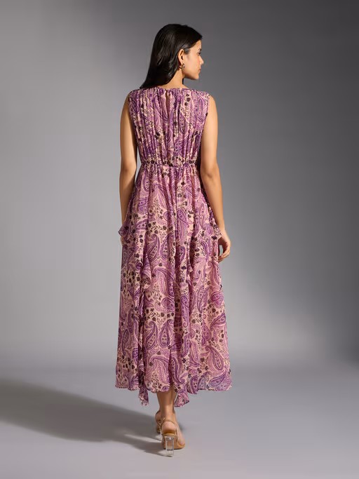Product Detail: This paisley printed sleeveless maxi dress features a round neck, a fit and flare silhouette, a keyhole detail at the back and ruffle detail.