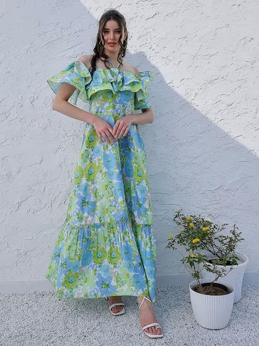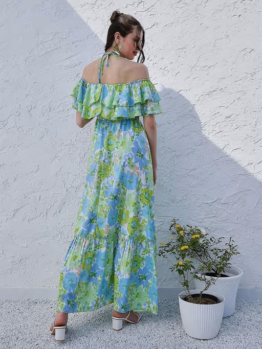 Be The Centre Of Attention With This Captivating Floral Printed Halter Neck Tiered Gathered Crepe Maxi Dress - Blue From Athena. Made From High-Quality Polyester, This Piece Features Half Sleeves And A Halter Neck. Style It With Minimal Jewellery And Sandals To Complete The Ensemble.