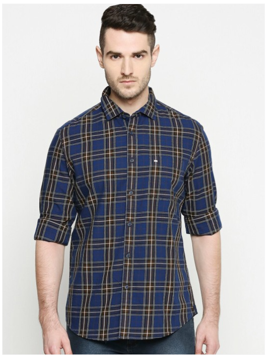 Navy blue and brown tartan checks checked opaque Casual shirt ,has a spread collar, button placket, 1 patch pocket, long regular sleeves, curved hem