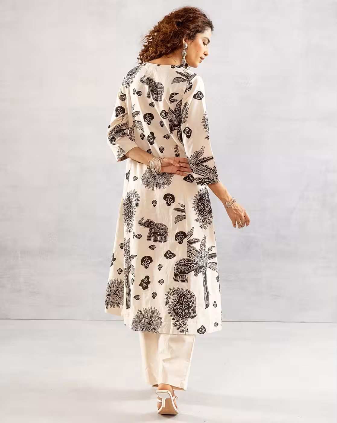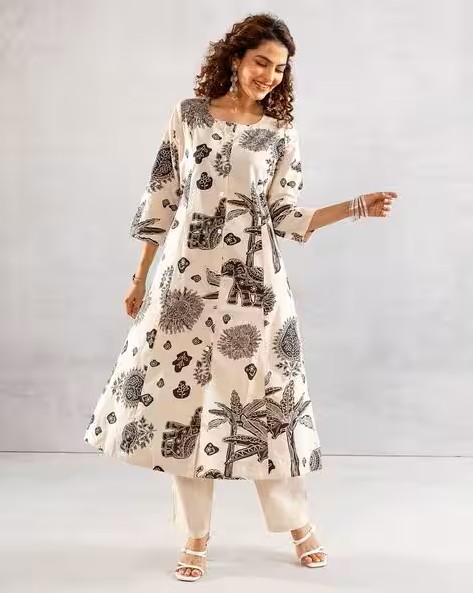 At the heart of this ensemble is the A-line kurta, adorned with captivating animal prints that exude femininity and charm. The straight silhouette of the kurta offers a flattering fit. Paired with coordinating pants, this set offers versatility and style.
