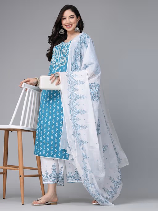 Rayon floral printed kurta with embroidery, border printed Pant which has full elasticated waistband and printed voile dupatta. Products Kurta Length-46" inch, pant length-38" inch and Dupatta Length- 2.30 Mtr. Pair it with stunning jewellery and heels to flaunt yourself.