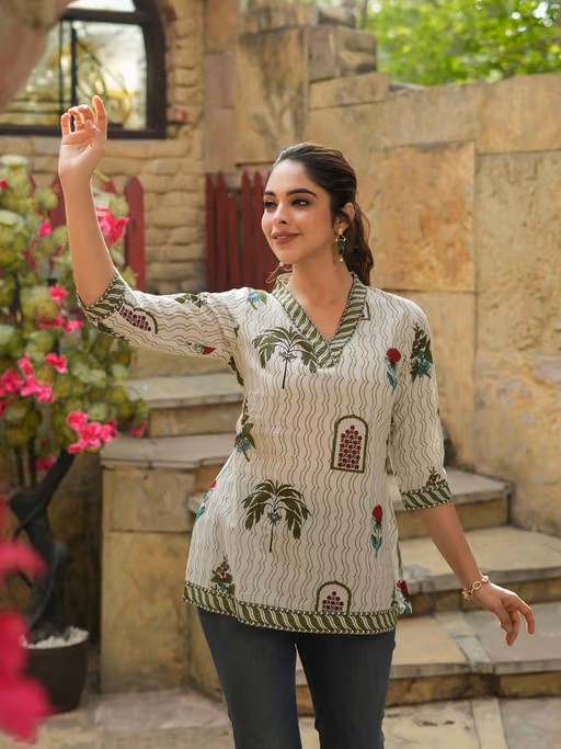 Effortlessly stylish, this Rain & Rainbow Women Green and Off White Floral Printed Pure Cotton Short Kurti blends classic charm with modern ease. It is crafted from high-quality fabric. It features three fourth sleeves, v-neck style. It's the epitome of understated elegance, perfect for festive, wedding, or special occasions.