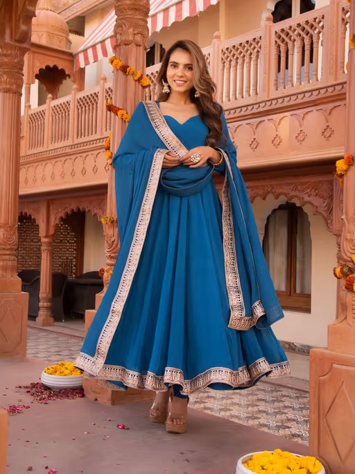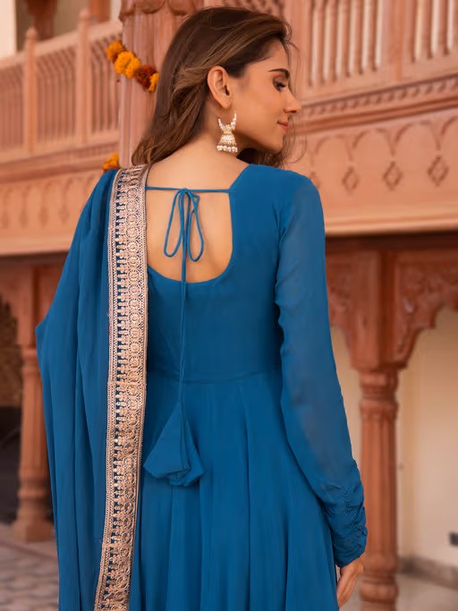 Serene ocean blue gota patti georgette Anarkali suit set. Tailored to sartorial perfection from premium quality fabric, it assures a soft and soothing touch against the skin. The exquisite silhouette adds to its appeal.