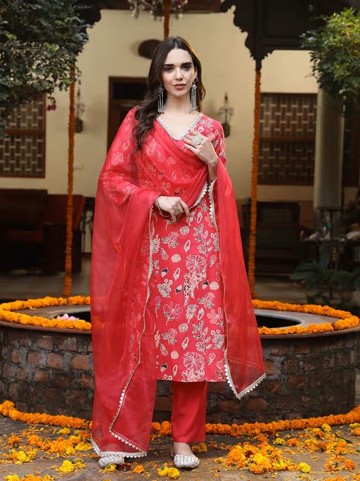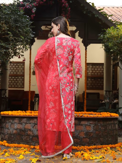 Pink Floral Printed Rayon Straight Kurta Pant Dupatta Set. Kurta Has Mirror Lace On V-Neck, 3/4 Sleeves. Fully Elasticated Solid Pant and Paired with Solid Organza Dupatta with Lace. Kurta Length- 45' Inch, Pant Length- 38' Inch, Dupatta Length-2.30 Matr.