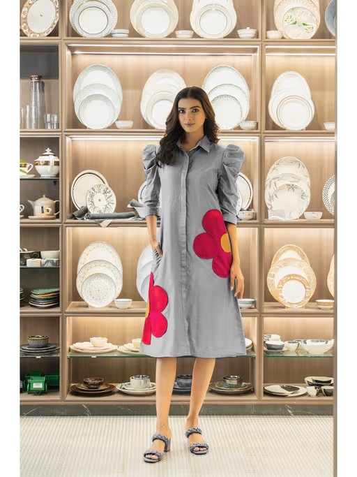 Step Into Elegance with Our Stunning Grey Dress, Adorned with Two Delicate Flowers. This Dress Is Perfect For Any Occasion, Offering A Blend Of Sophistication and Charm. Features: Design: Two Pink Floral Patch Accents Material: High-Quality, Breathable Fabric Fit: A-Line Silhouette Length: Knee-Length Styling Tips: Pair This Dress with Heels and A Clutch For A Chic Evening Look, Or Dress It Down with Ballet Flats For A Casual Day Out, Perfect For: Casual Outings, Evening Events, Daytime Gatherings