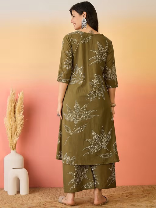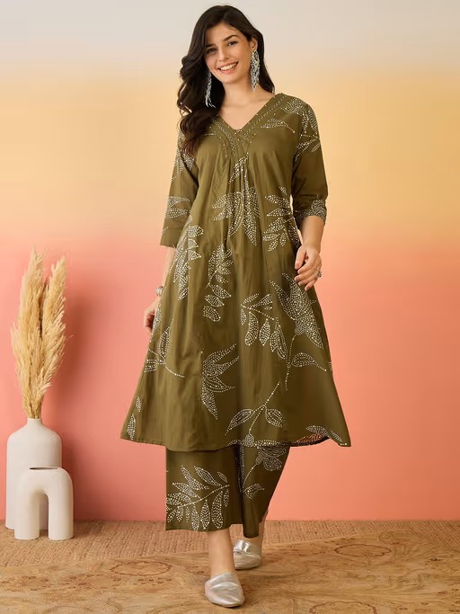 Women Pure Cotton Green Abstract Printed A-line Kurta with Palazzo (Set of 2)