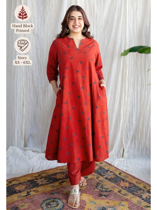 Red A-Line Ajrakh Printed Cotton Kurta With Split V Neck & Embroidered