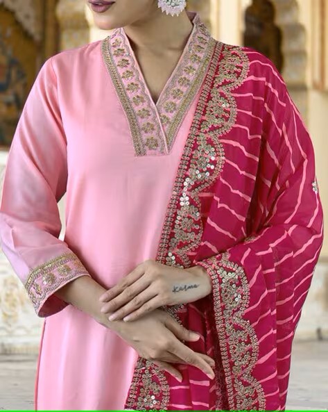 - The kurta is made of Viscose fabric, paired with Viscose fabric for the bottom, and complemented by a Silk Blend fabric dupatta.