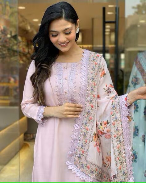 - Crafted from premium fabric, this straight kurta features exquisite lace work, creating a stunning visual appeal. The solid pants provide a perfect balance, grounding the elaborate design of the kurta. The dupatta is enhanced with contrasting floral print, adding a unique touch to the overall look.
