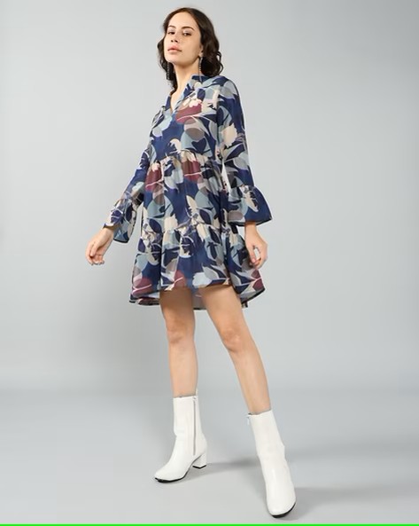Shein Flounce Sleeves Pleated Hem Abstract Print Skater Dress