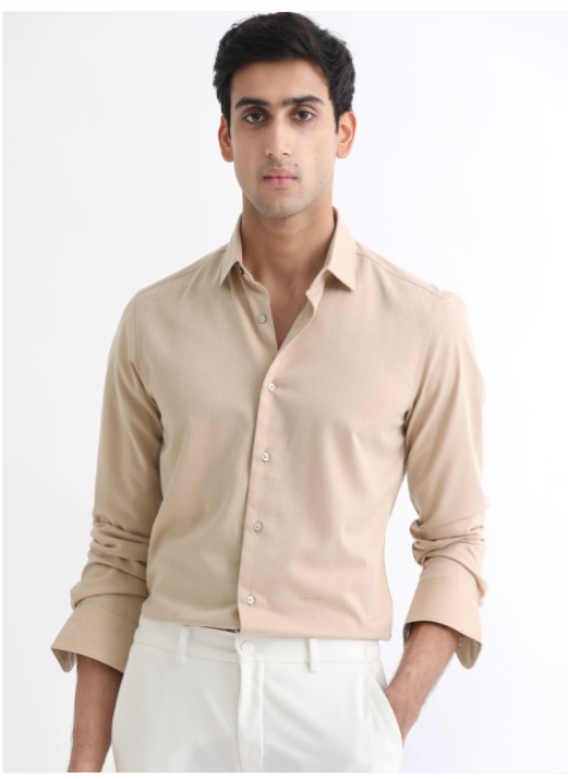 Beige solid opaque casual shirt ,has a spread collar, button placket, long regular sleeves, curved hem
