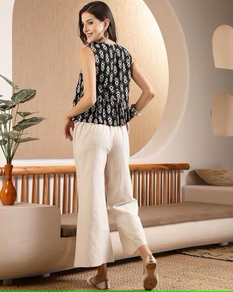 • Black ikat printed rayon sleeveless short top and cotton blend lurex pant set. Top has v-neck with front button placket.