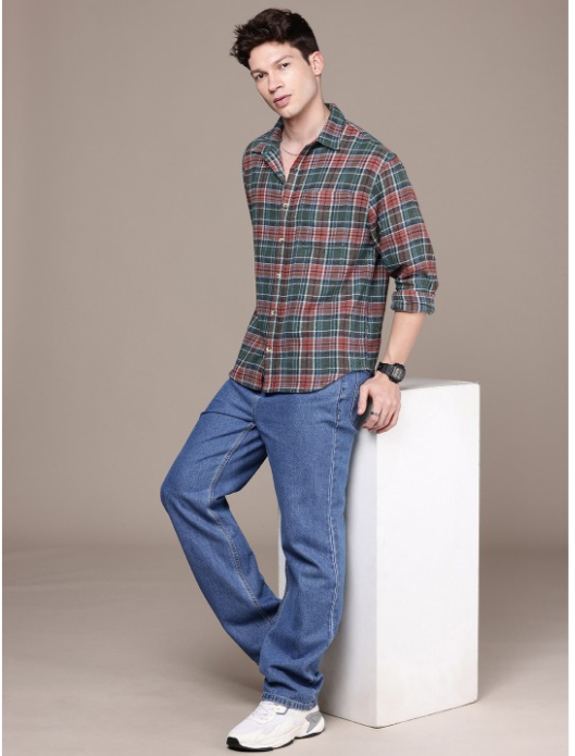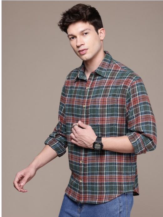 Rust & olive green other checks opaque casual shirt ,has a spread collar, button placket, 1 patch pocket, long regular sleeves, curved hem