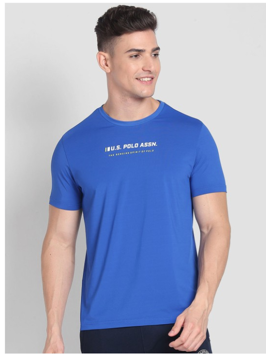 Blue printed lounge t-shirt has regular length, has a crew neck and short sleeves