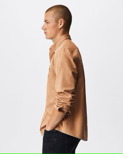 • BEIGE EMBROIDERED LOGO BUTTON-DOWN SHIRT FOR MEN.