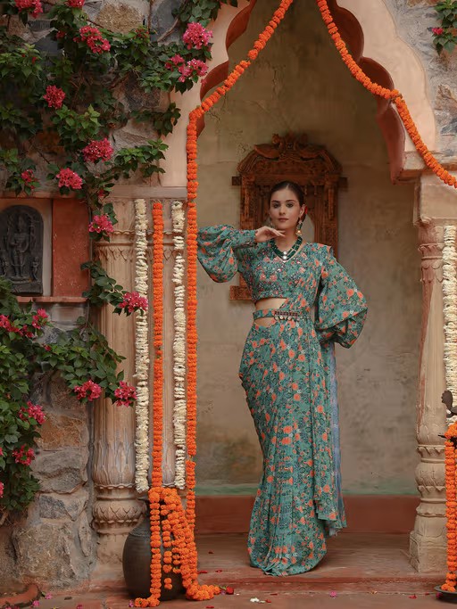 The Saree Features A Captivating Boho Print with Motifs That Seamlessly Blend Shades Of Green. These Two Contrasting Yet Complementary Colours Create A Visually Stunning Effect. The Motifs On The Saree Are A Delightful Mix Of Traditional and Contemporary Elements, Incorporating Geometric Patterns, Floral Designs, and Abstract Shapes Creating Eclectic Look That Captures The Essence Of Bohemian Fashion. The Blouse Features A Balloon Sleeves and A V-Neckline. and A Belt Cinched with An Embroidery Patch At The Centre