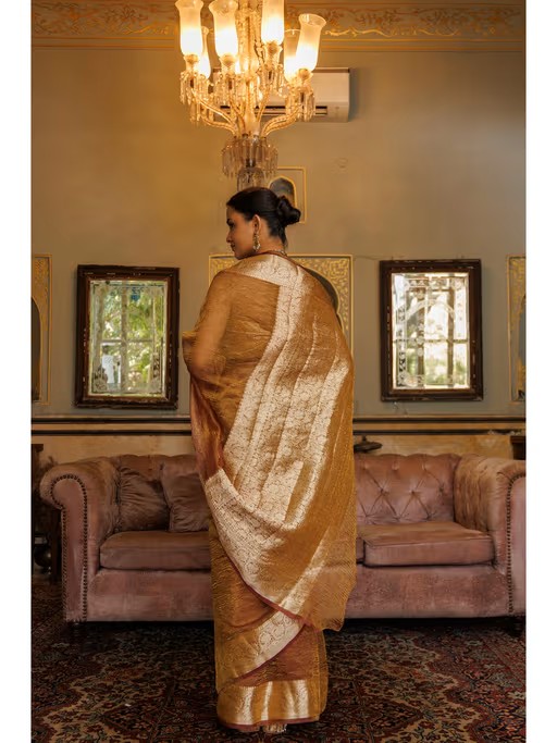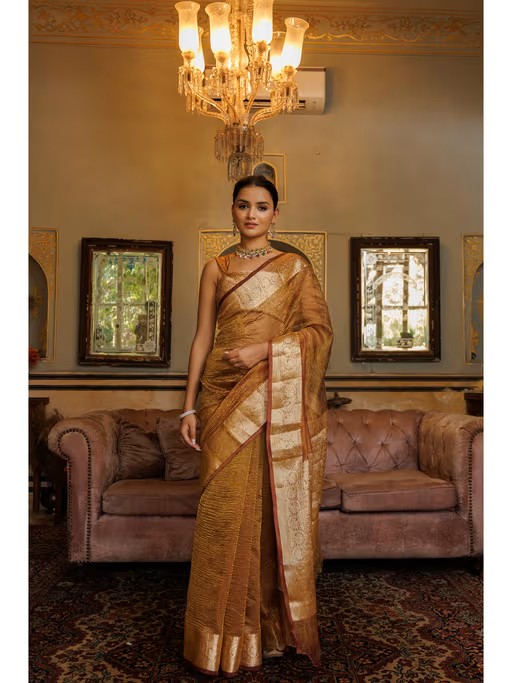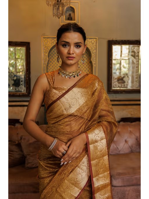 Step into grace with this Geroo Jaipur Copper Crinkle Banarasi Tissue Saree with Unstitched Blouse . Geroo Jaipur ethnic sarees come with a blouse piece, which can be stitched according to your taste and preference, with this beautiful design and fabric, this saree will fetch you oodles of compliments and praise.