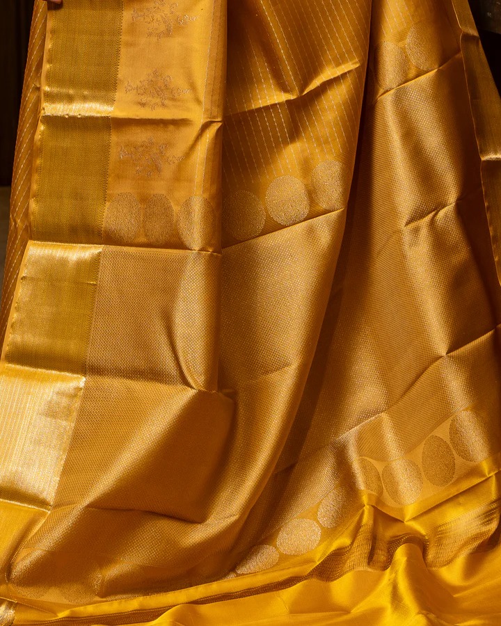 this golden yellow silk saree features a gold border, a timeless design that never goes out of style. The elegant thread brocade and embossed finish make this saree ideal for formal and casual occasions.