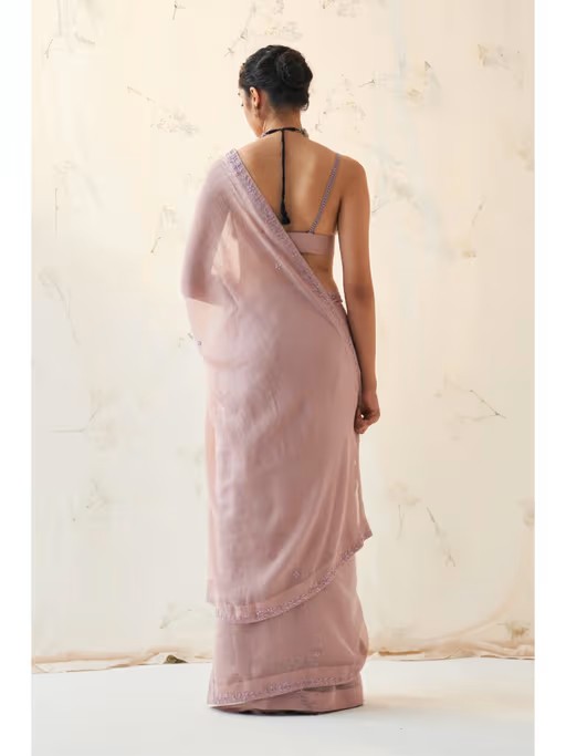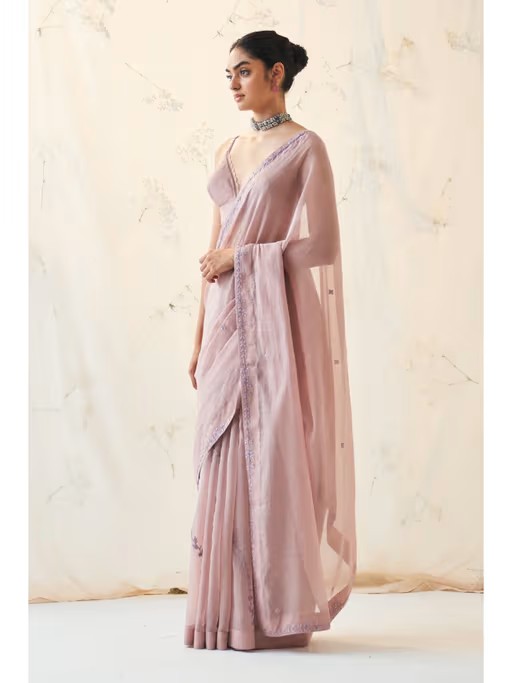 Indulge In Sheer Luxury with The Exquisite Lavender Shade Chanderi Saree Adorned with Hand-Crafted Leafy Jaal, Exuding Elegance. The Bralette Blouse Featuring Intricate Croatia Work On The Strings Adds A Touch Of Glamour, Making This Ensemble A True Symbol Of Sophistication and Opulence. Make A Statement with This Stunning Attire.