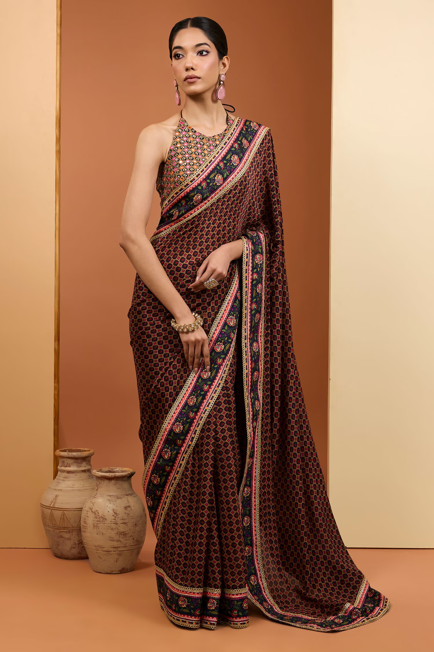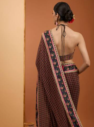Black saree featuring floral digital print and lace embroidery. Accompanied by a mirror embroidered halter neck blouse and a solid petticoat.
