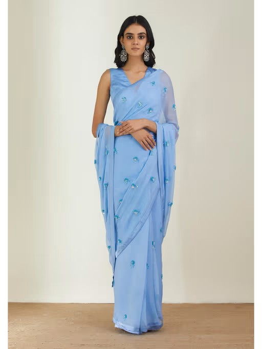Elevate your ethnic wear wardrobe with Label Earthen blue saree, stitched blouse. It features floral pattern with sleeveless, v-neck with , bottom style . It is crafted from finest material. This outfit is perfect for special occasion. Add trendy footwear to complete the look.