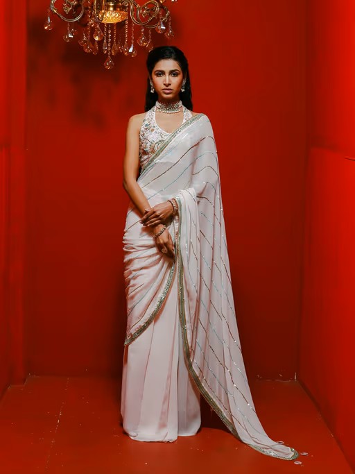 Sequins Saree Paired with A Chic Halter Neck Blouse. This Glamorous Ensemble Features All-Over Sequin Embellishments That Catch The Light Beautifully