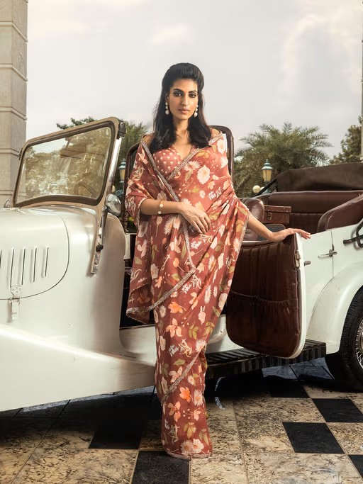 Make a timeless impression with this Brown printed saree that embodies whimsical blooms. Set in organza & muslin, the saree features adda embroidery with cut-daana, sequins & beads. The saree is available in both stitched and unstitched options. The pre-draped stitched saree comes with an attached petticoat, elastic waistband & an unstitched blouse bearing the same hand embroidery Brown border.