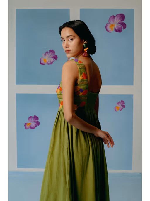 Olive Green Scoop Neck Gathered Dress With Texture Embroidery On Yoke And Lace Applique On Bottom Flare. Fit: Regular Fit. Garment Length: 55" Inches model Info: Height: 5 Ft. 7 In. | Wearing Size Swash Care: Cold Water/Hand Wash