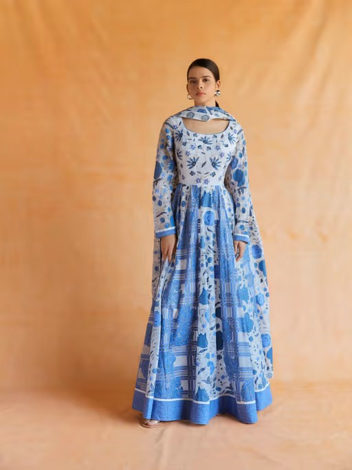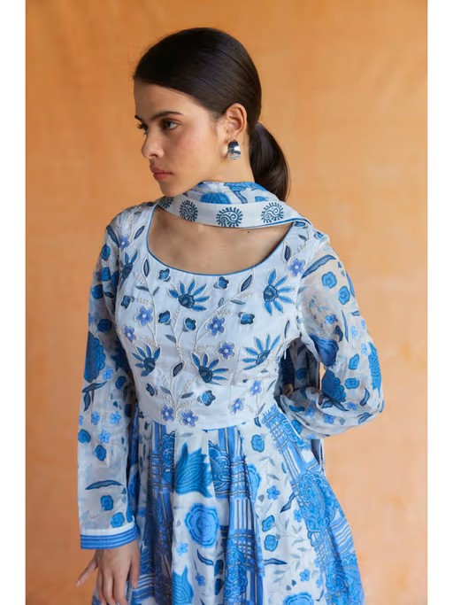 Blue And White Printed And Embroidered Anarkali With Dupatta