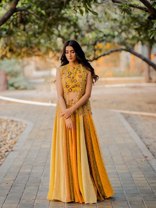 Overflowing colours of yellow makes this kali sari with jacquard lehenga and blouse ecstatic. Styled with a dori and glass beads embroidered jacket, it fits in the bright mood of summer.